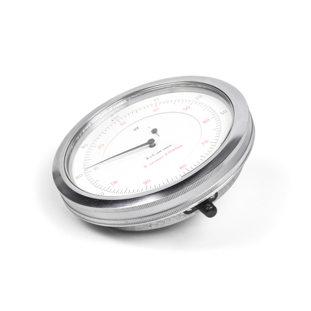 Шкала индикатора имеет цену деления 0.01 мм. Тип 1ИЧТ, габаритные размеры: 102х122х43 мм.