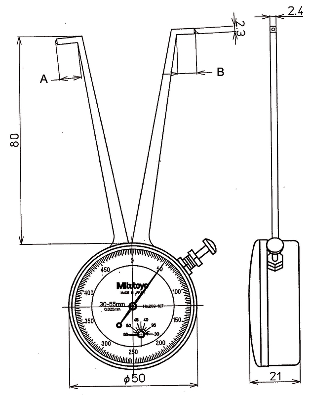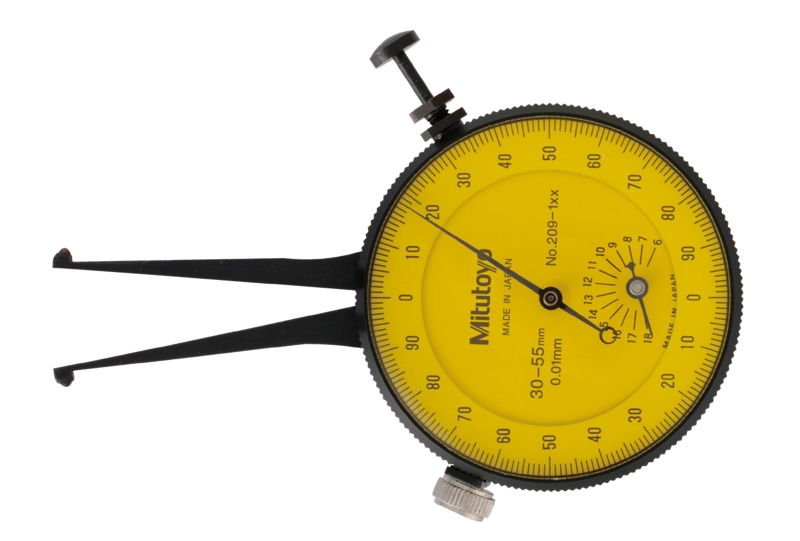 Для того чтобы измерить внутренние размеры детали необходимо зажать боковой рычаг, сжимая измерительные пластины, поместить их концы в отверстие и медленно отпускать рычаг, пока пластины не упрутся в стенки. Представленная модель обладает индикатором часового типа, откуда считываются показания.