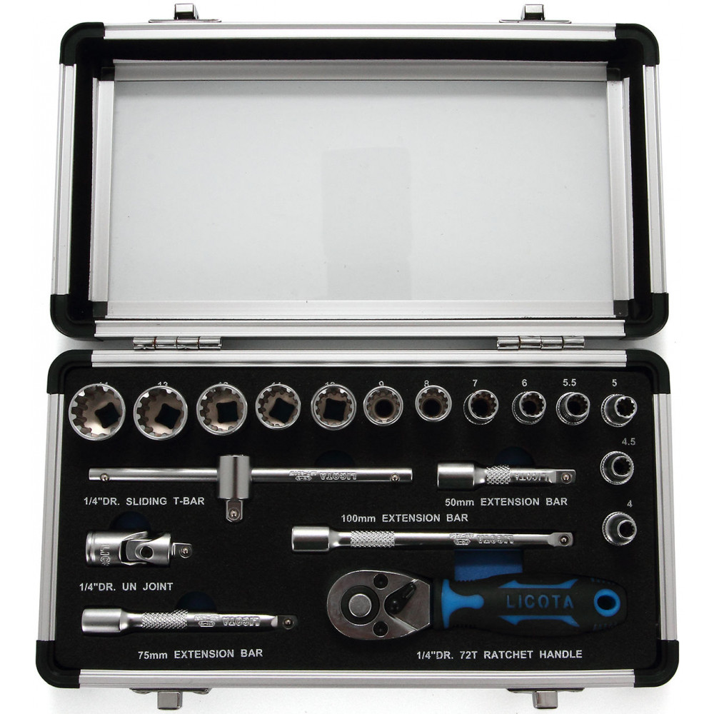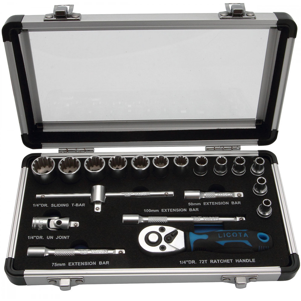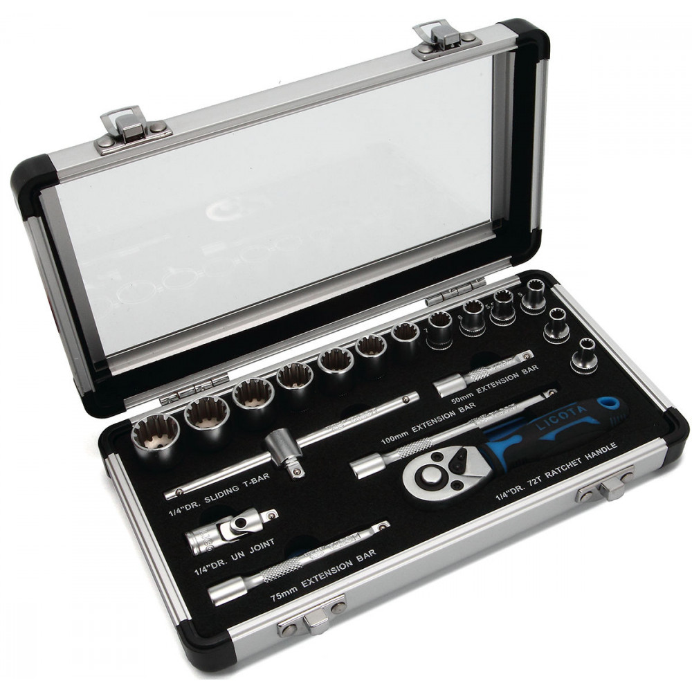 Набор торцевых головок с аксессуарами Licota ALM-3001 предназначен для ручного монтажа/демонтажа резьбового крепежа с рабочим профилем Spline. Размер привода - 1/4".