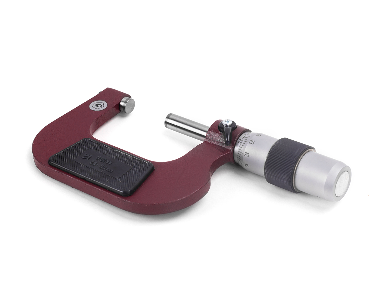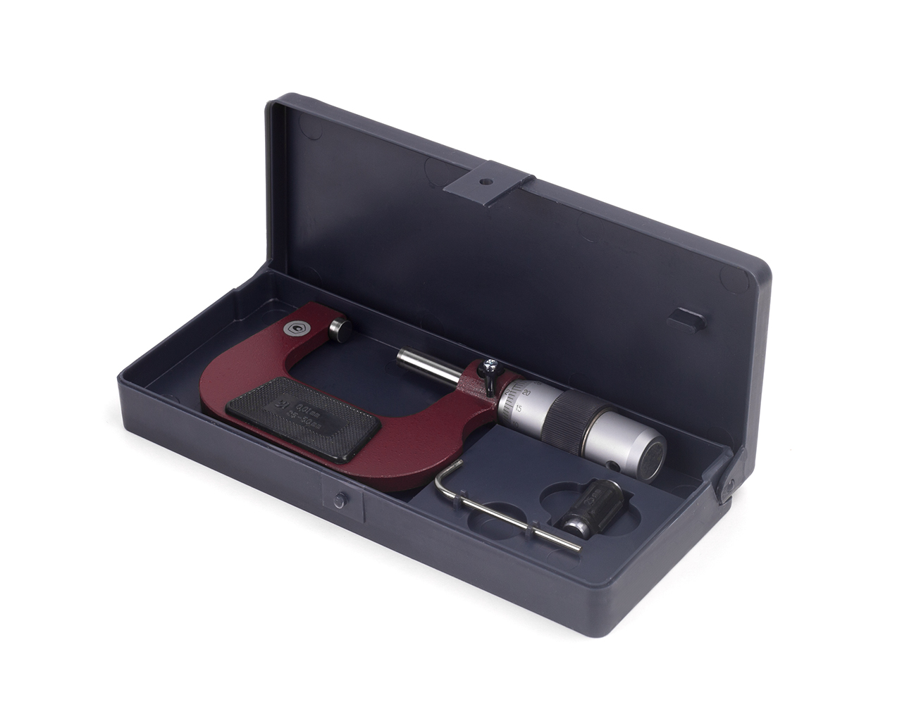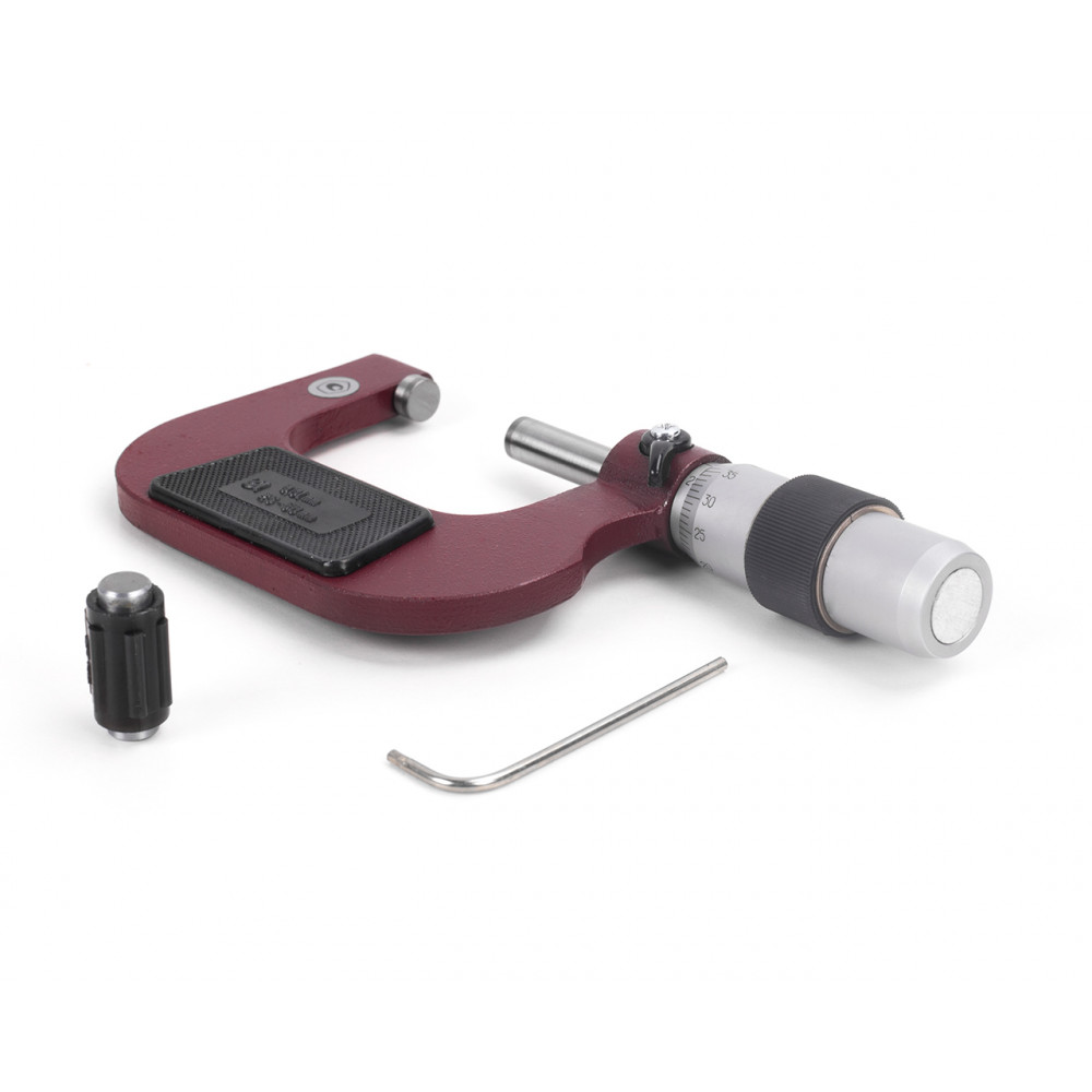 Микрометр МК- 50 0,01 кл.т.2 с пов. КировИнструмент* — средство для измерения наружных линейных размеров. Основанием микрометра является скоба, а преобразующим устройством служит винтовая пара, состоящая из микрометрического винта и микрометрической гайки, укреплённой внутри стебля; их часто называют микропарой. В скобу запрессованы пятка и стебель. Измеряемую деталь охватывают торцевыми измерительными поверхностями микровинта и пятки. Барабан присоединён к микровинту с помощью колпачка в котором находится корпус трещотки. Чтобы приблизить микровинт к пятке, вращают барабан трещотку по часовой стрелке (от себя), а для обратного движения микровинта (от пятки) барабан вращают против часовой стрелки (на себя). Закрепляют микровинт в требуемом положении стопором.