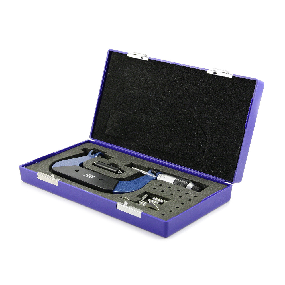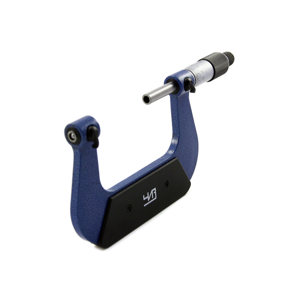 Микрометр резьбовой МВМ-100 0,01 ЧИЗ* используется в промышленности для измерения среднего диаметра резьбы. Для получения необходимого значения одновременно замеряют и внешний и внутренний диаметр. Угол наконечника призматической вставки необходимо сопоставлять с размером гребня, угол конусной - с размером канавки. В комплекте к инструменту идет свой набор пар вставок различной формы для каждого профиля резьбы. Так же к резьбовому микрометру прилагается установочная мера. Показания снимаются со шкалы стербля и барабана.