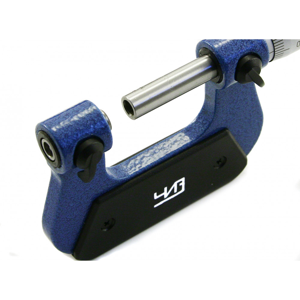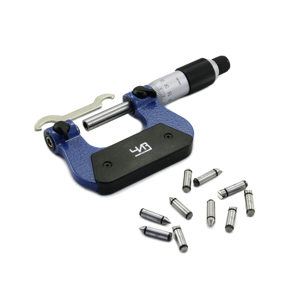 Микрометр резьбовой МВМ- 25 0,01 ЧИЗ* используется в промышленности для измерения среднего диаметра резьбы. Для получения необходимого значения одновременно замеряют и внешний и внутренний диаметр. Угол наконечника призматической вставки необходимо сопоставлять с размером гребня, угол конусной - с размером канавки. В комплекте к инструменту идет свой набор пар вставок различной формы для каждого профиля резьбы. Так же к резьбовому микрометру прилагается установочная мера. Показания снимаются со шкалы стербля и барабана.