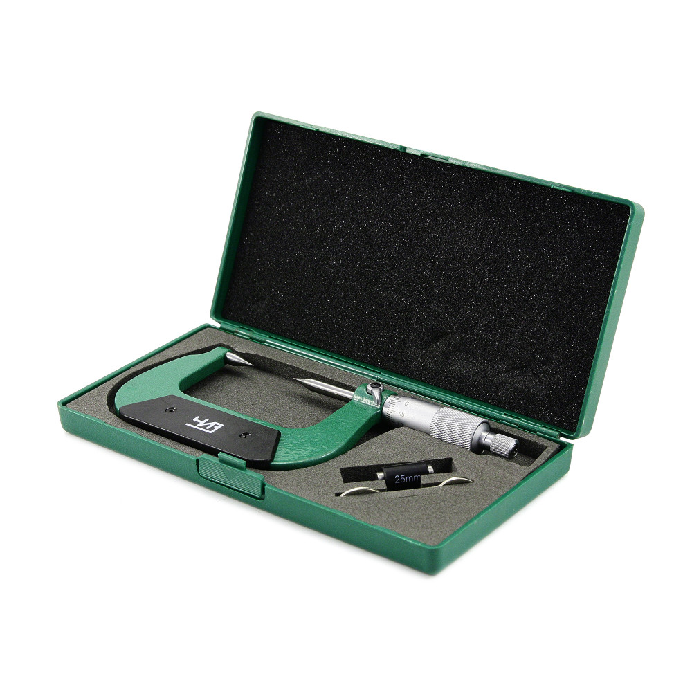 Микрометр точечный МК-ТП- 25 0.01 ЧИЗ* дает возможность измерить деталь в труднодоступных местах, например пазах и шлицах, имеющих сложную форму. Эта модель отличается заостренными продолговатыми наконечниками, сужающимися под углом 30° до толщины 0,3 мм, которые проникают вглубь отверстия, которые необходимо измерить.