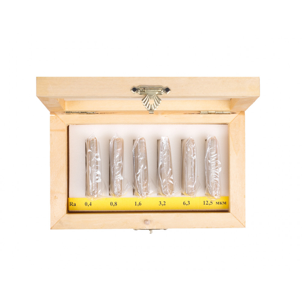 Комплектация набора: 6 пластин со средним арифметическим отклонением профиля (Ra) 0,4; 0,8; 1,6; 3,2; 6,3; 12,5 мкм.