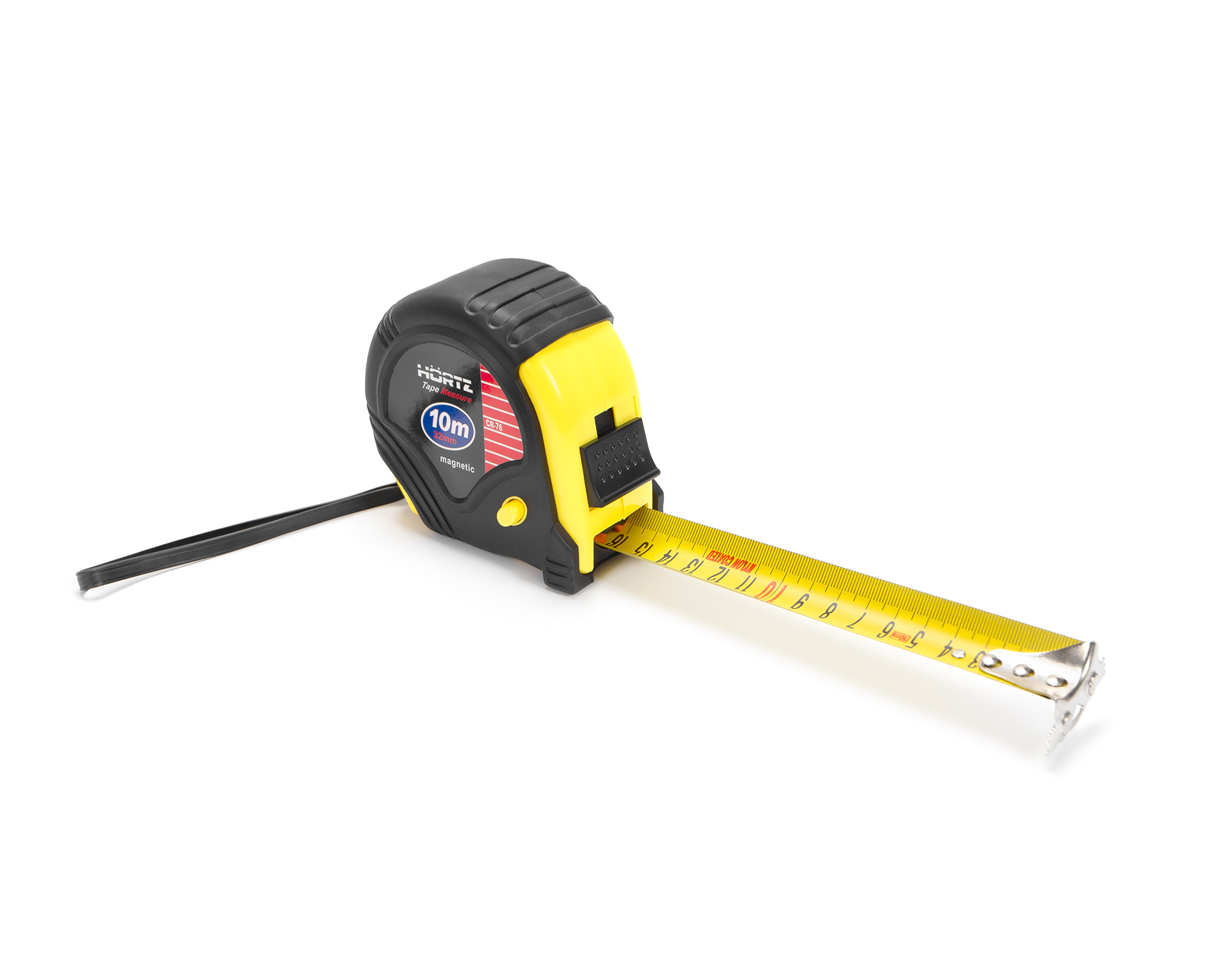Рулетка 10 м -HORTZ предназначена для измерений линейных размеров. Представляет собой гибкую ленту с миллиметровой шкалой, выполненную из металла, сворачиваемую в рулон. Лента выдвигается с усилием, при этом имеет возвратную пружину, которая позволяет ей автоматически сматываться обратно в корпус.С внешнего конца лента оборудована стальным уголком, для зацепа за край поверхности, а также для нанесения разметки на мягких материалах. Фиксация длины осуществляется с помощью стопора на корпусе.