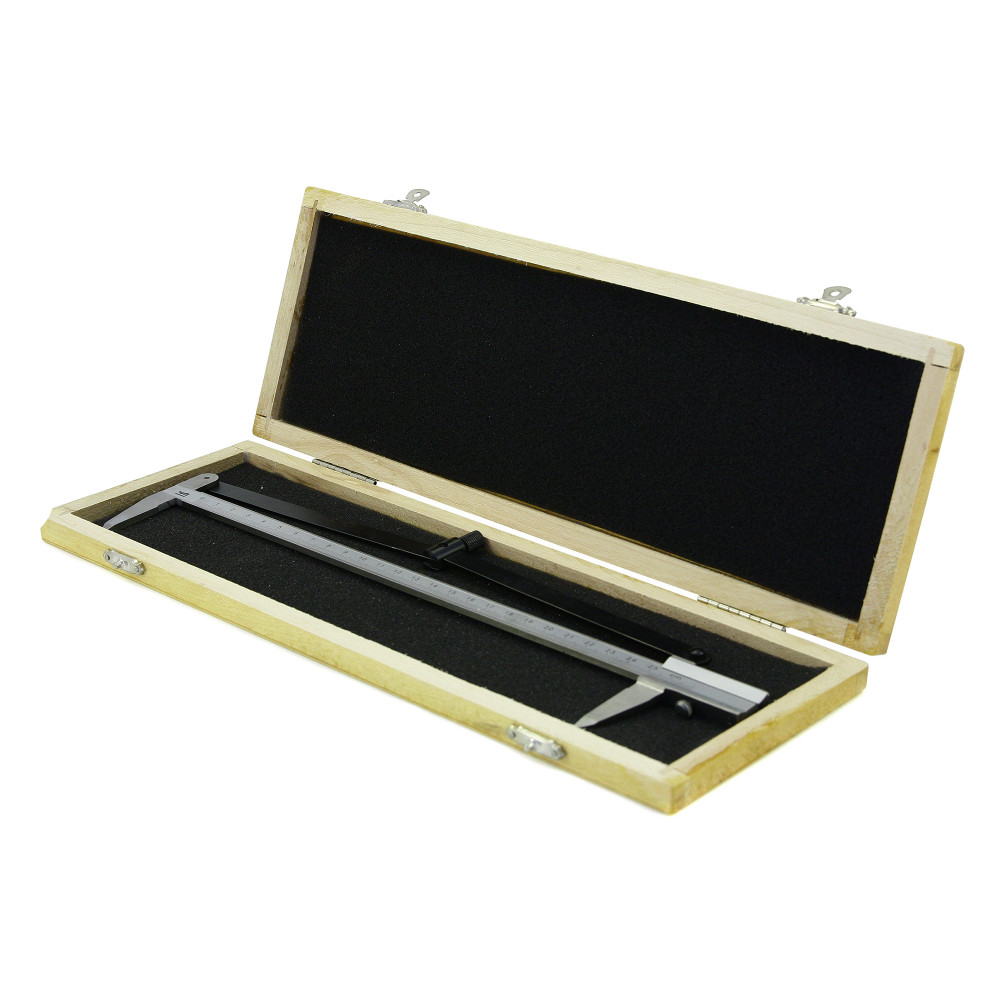 Результаты измерений снимаются по шкале со штанги, которая показывает целые миллиметры и с нониуса, показывающего их доли. Материал изготовления - инструментальная сталь, измерительные губки закалены. Штангенциркуль поставляется в пластиковом или деревянном кейсе.