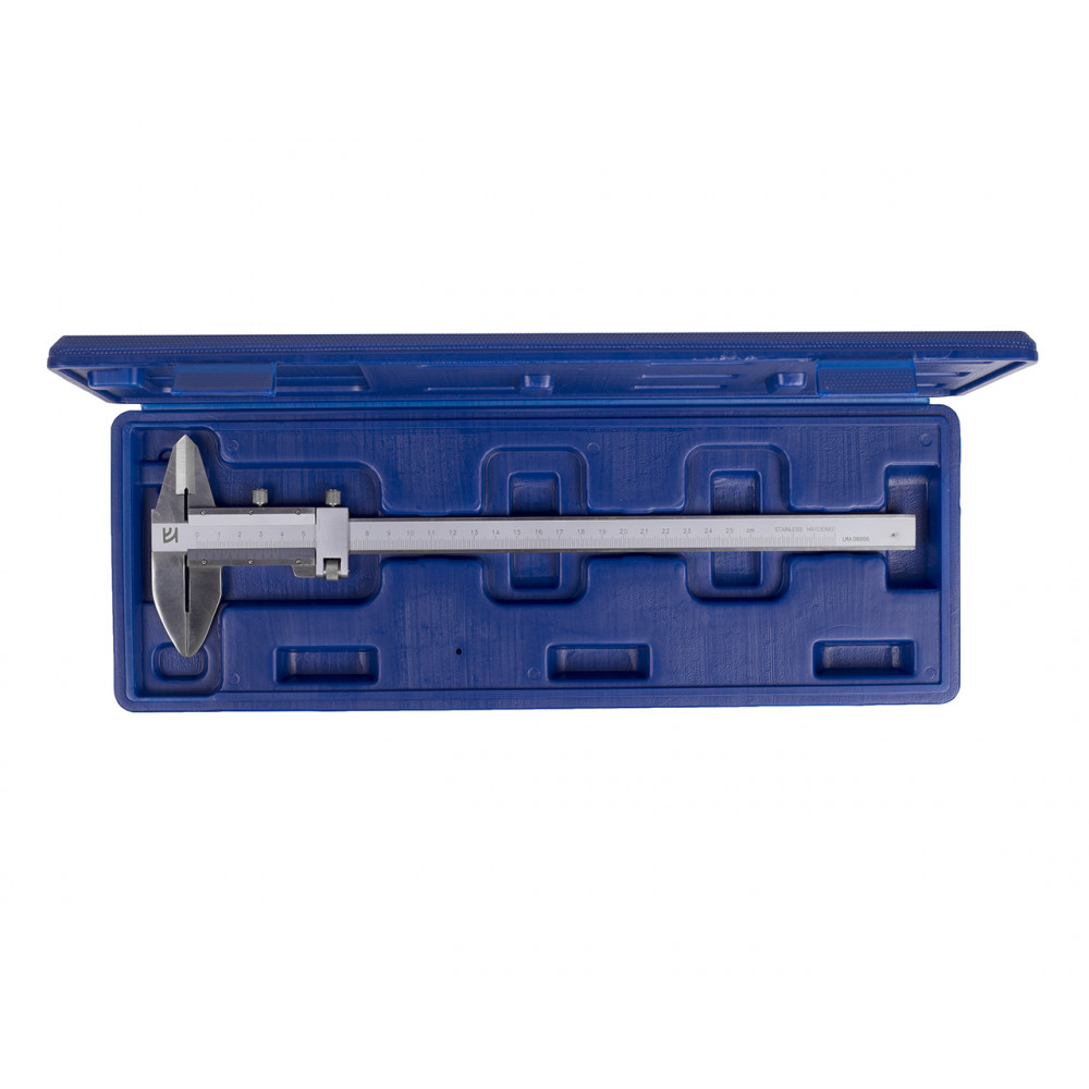 Результаты измерений снимаются по шкале со штанги, которая показывает целые миллиметры и с нониуса, показывающего их доли. Прибор поставляется в специальном жестком кейсе.