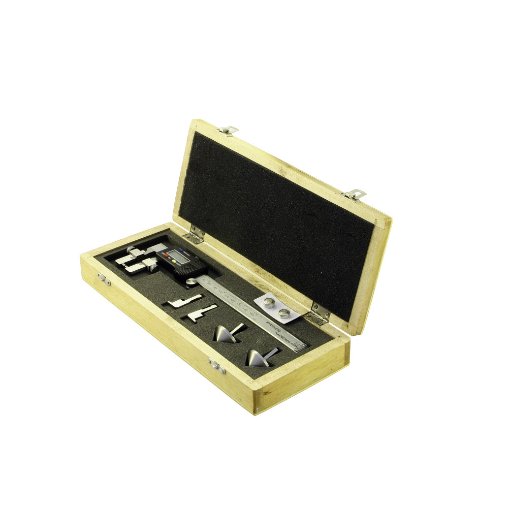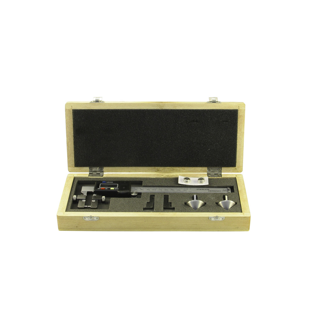 Особенность этой модели – сменные вставки, которые идут в комплекте. Фиксация вставок происходит с помощью специального механизма, благодаря которому они плотно и ровно зажимаются. Считывание показаний происходит по средствам электронного дисплея, куда они выводятся в готовом виде. Цифровой блок обладает функцией установки инструмента на ‘’нуль’’ и смены системы исчисления с метрической на дюймовую.